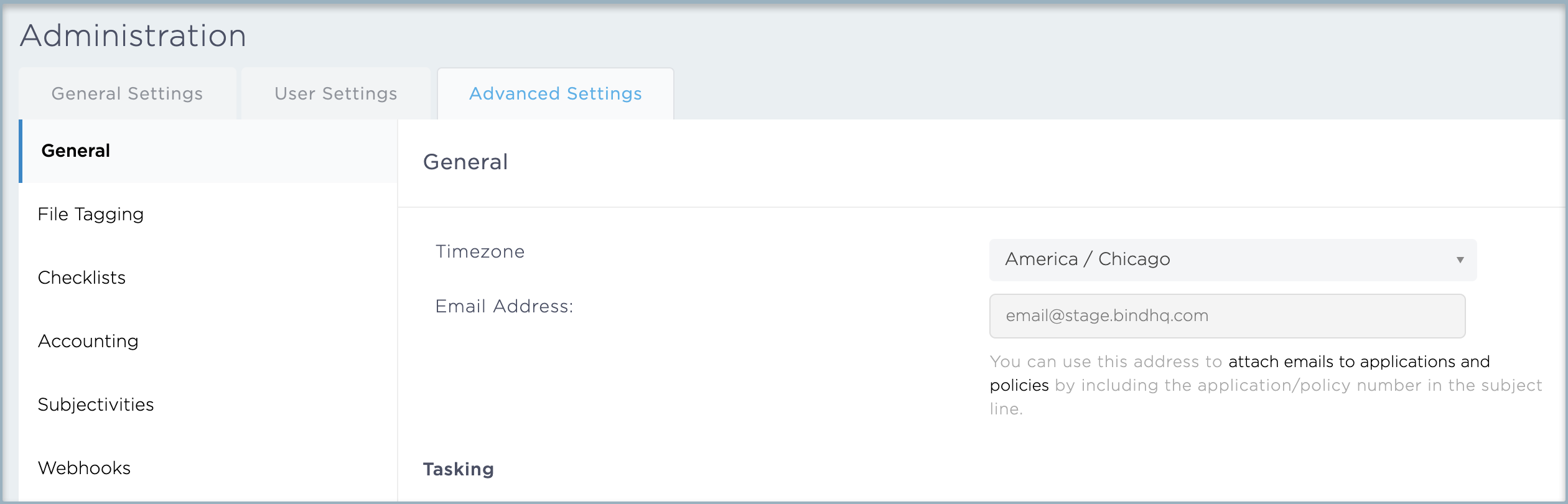 - Users can select the General section to update details like timezone, tasking, SLA details, agency statements, reports, and carrier portal options. Administrators can also upload a logo to BindHQ so that it prints on documents. The logo can be configured with PNG and JPEG as the supported image types.