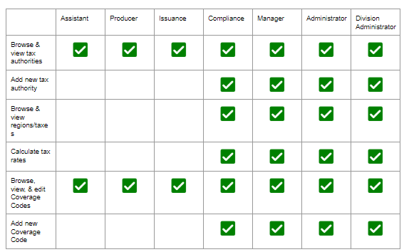 - All users have the Browse & view tax authorities and Browse, view & edit Coverage Codes options.