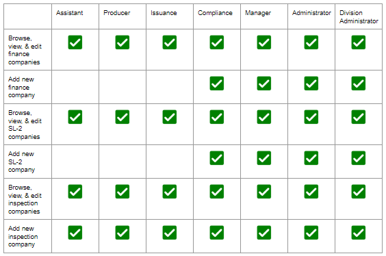 - All users have the Browse, view & edit finance companies, Browse, view & edit SL-2 companies, Browse, view & edit inspection companies, and Add new inspection company options.