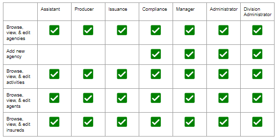 From the Agents & Insureds section, all users have the Browse, view & edit agencies, Browse, view & edit activities, Browse, view & edit agents, and Browse, view & edit insureds options.