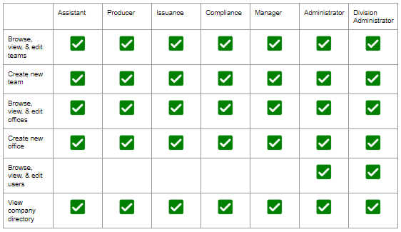 - All users have the Browse, view & edit insurance carriers and Browse, view & edit marketing companies options.