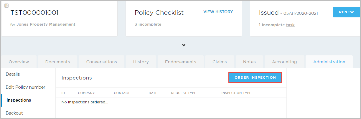 Ordering an Inspection from the Administration tab