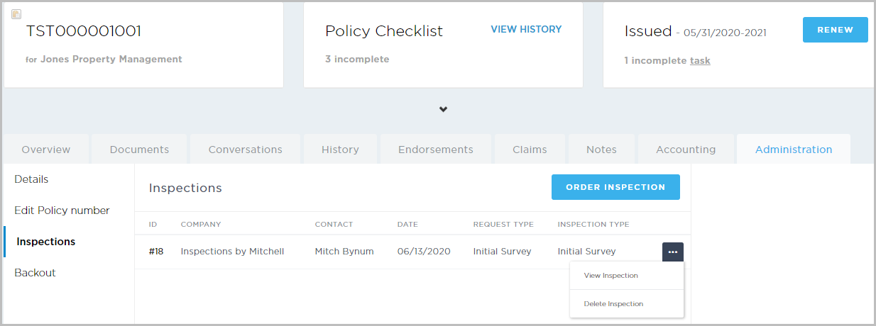 - The inspection is ordered and displays on the Inspections page. You can click the ellipsis on the right to view or delete the inspection.