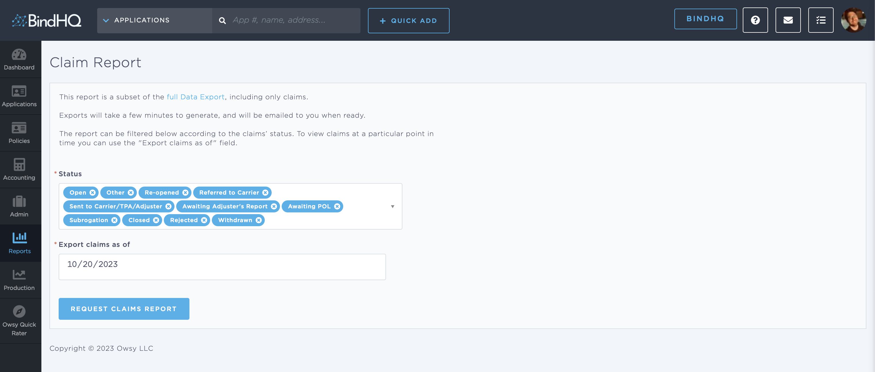 You can find this report by going to the “Reports” tab in the side navbar, then going to “Production”, and then selecting “Claims Report.”