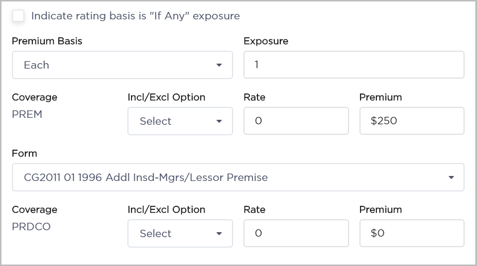 - If applicable, enter a premium. If there is no premium associated with the additional insured, select Included from the Incl/Excl Option drop-down.