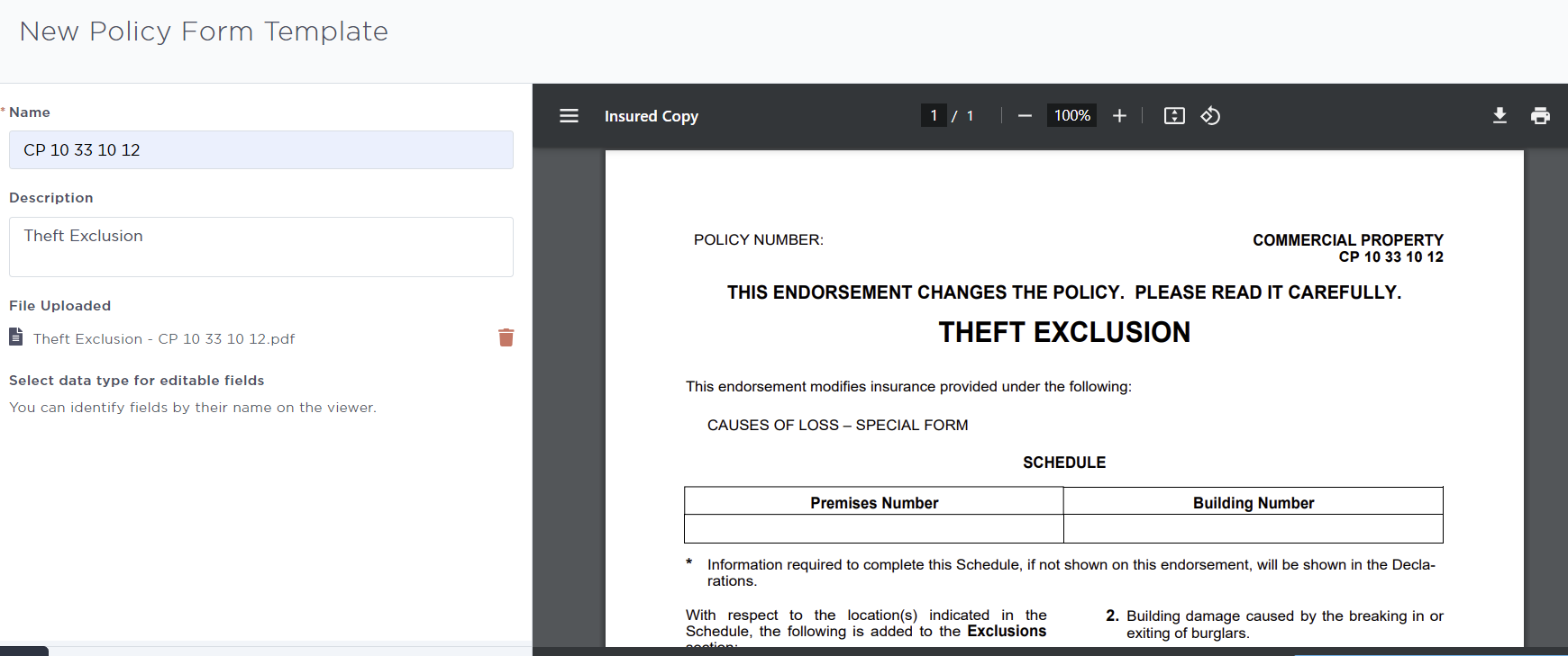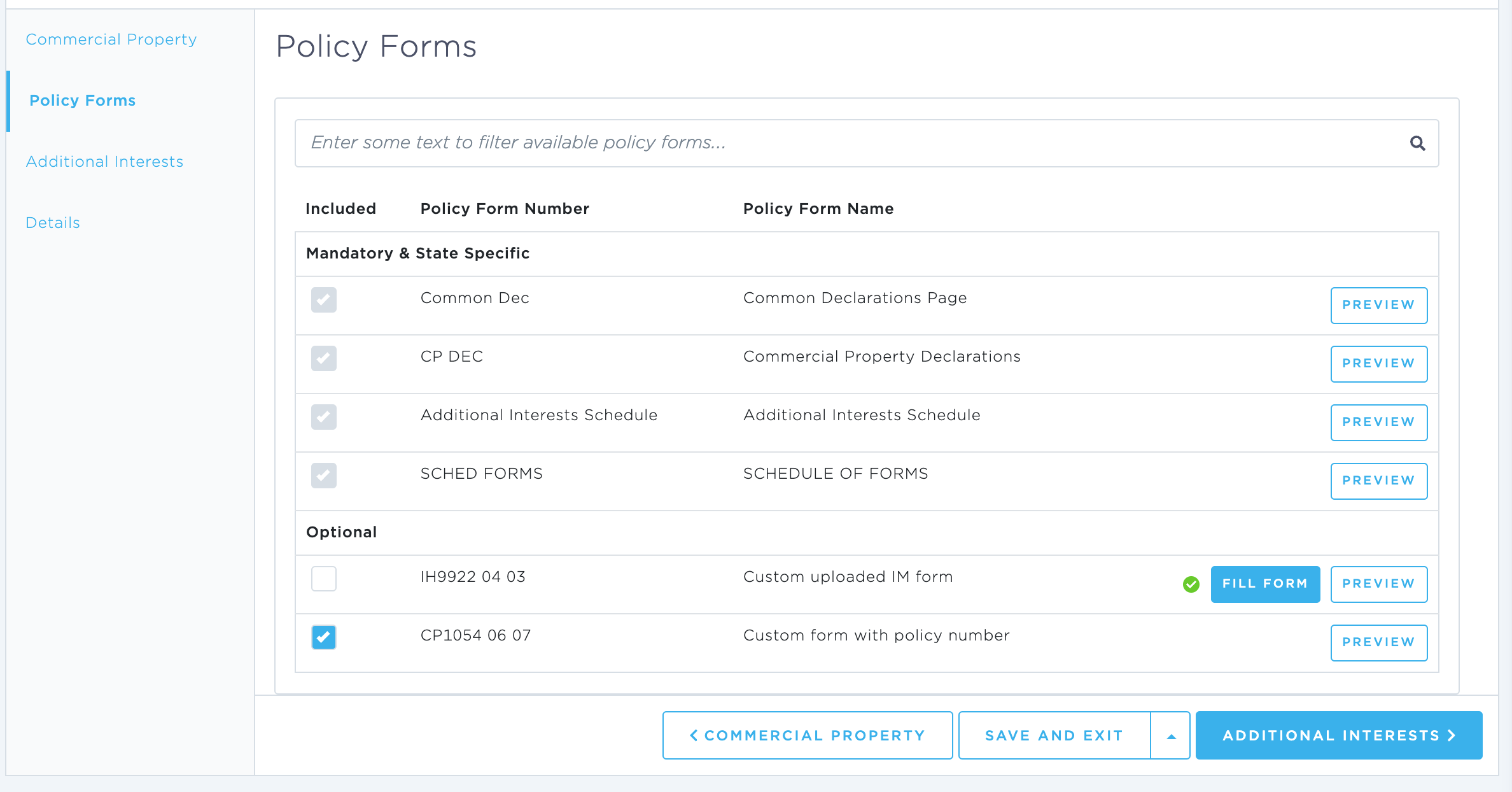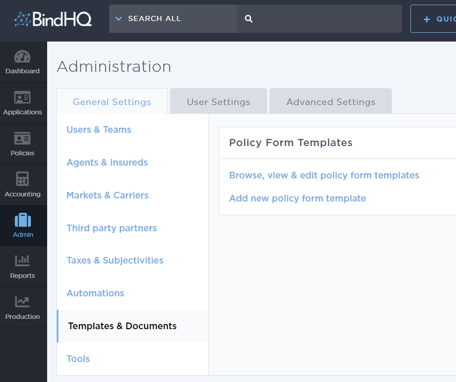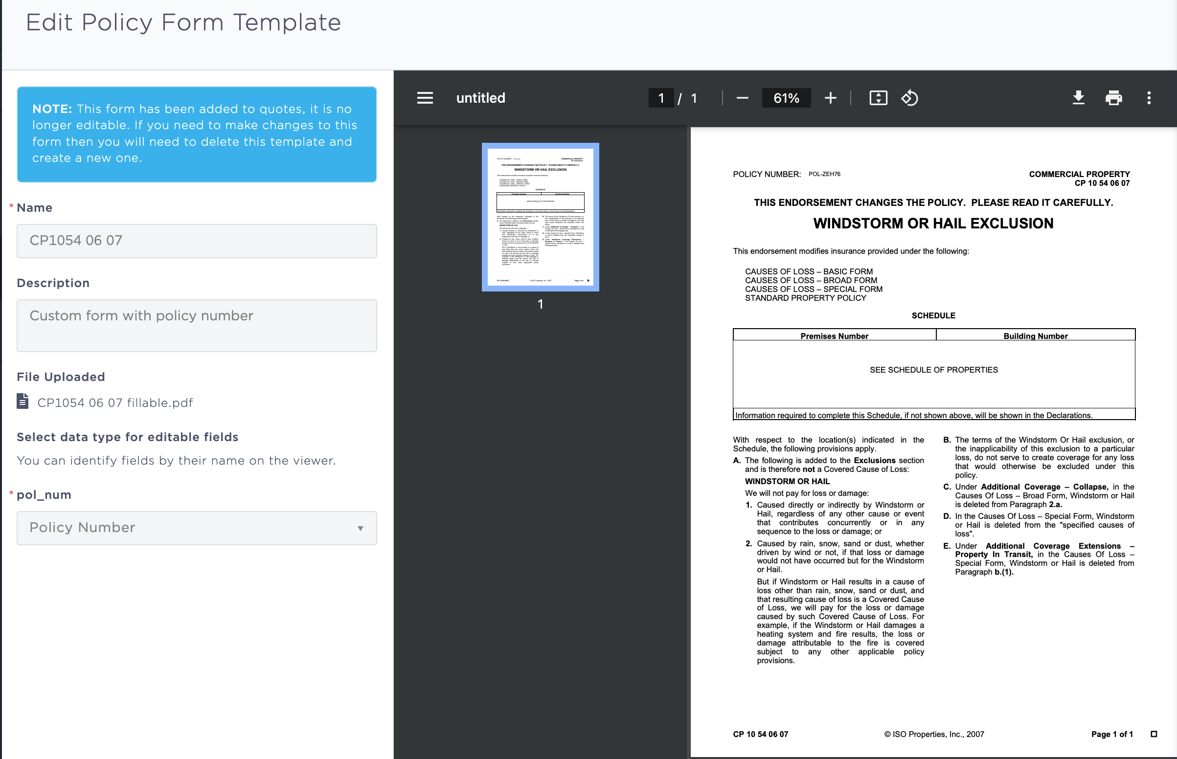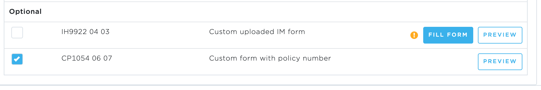 Admins can add Policy Forms to Quote Templates (or Programs). To learn about how to add and configure policy forms on Quote Templates click here.