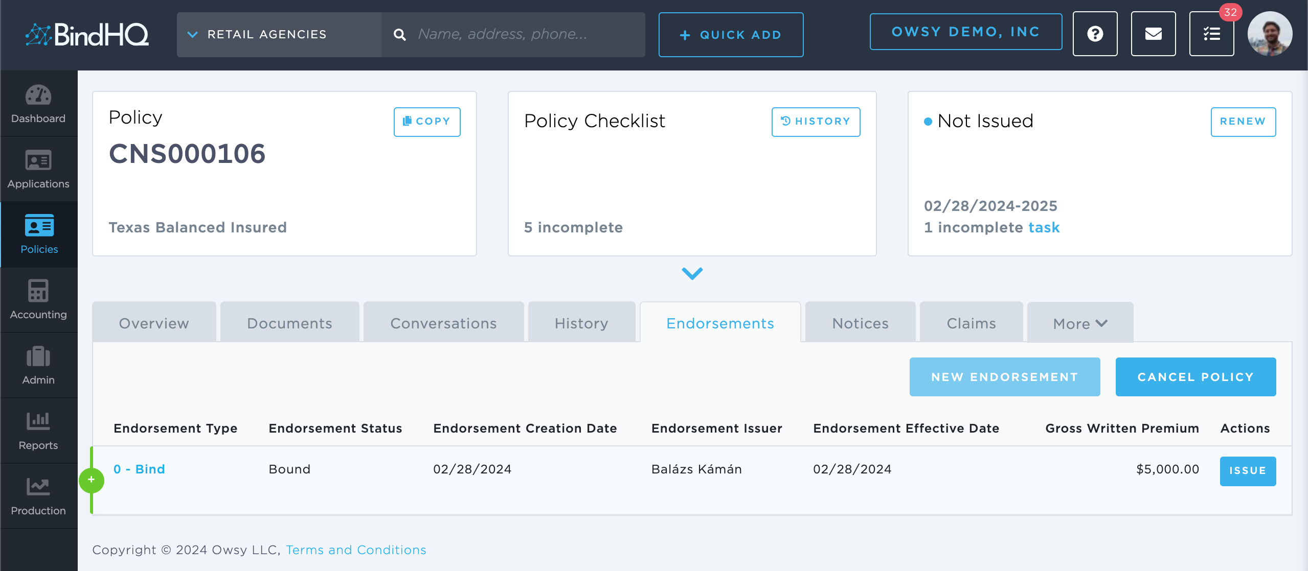 To issue a Policy and generate the Policy Issuance packet, simply click Issue on the Bind Endorsement, under the Endorsements tab of the policy.
