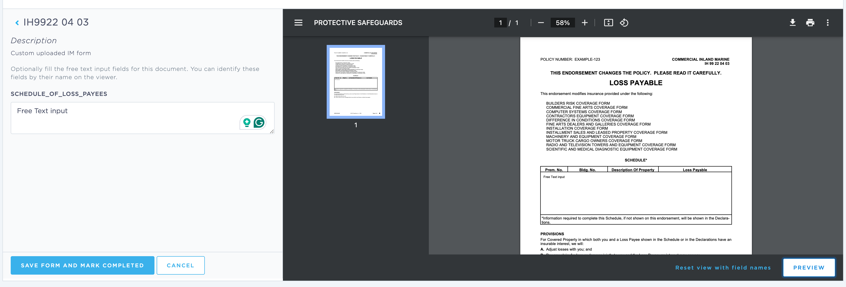 Users creating the quote, or working on policy issuance can click 'Fill Form' on the quote to enter a free text: